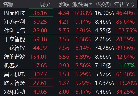 人形机器人概念冲高回落后再度走强,恒而达一度触及20cm涨停,固高科技涨超12%,江苏雷利涨超9%,伟创电气、丰立智能、三花智控涨超6%,绿的谐波、机器人、昊志机电、航天智装、双环传动等涨超5%。